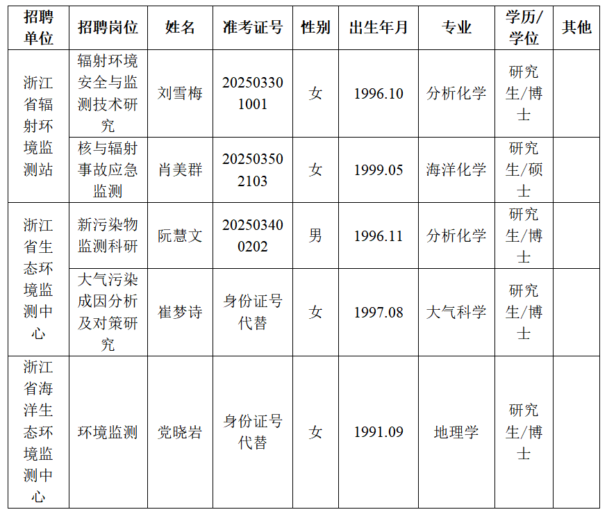 浙江省生态环境厅所属部分事业单位 2025年下半年公开招聘拟聘用人员公示